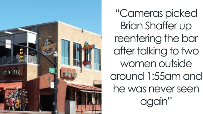 * Brian Shaffer disappeared *entering* a bar, not leaving it. His friends were there and he was seen on security camera twice, but wasn’t seen leaving by his friends or security cameras.