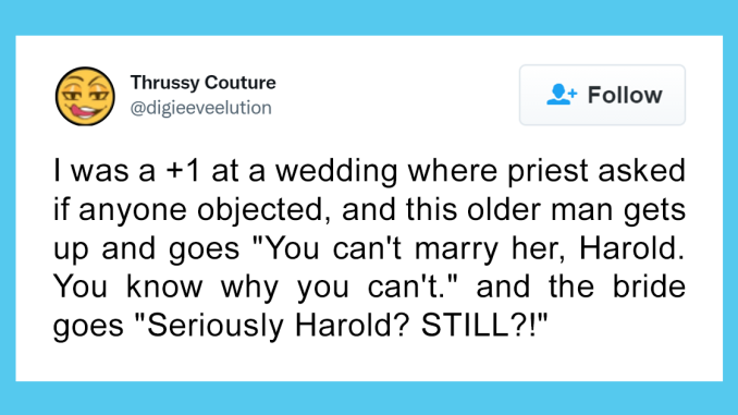 However, these sorts of objections happen in real-life, too. But they might look very different from what you’ve seen on-screen. Twitter users from all over the world pitched in and spilled the tea about some of the most memorable wedding objections that they’ve ever witnessed, after business owner Sienna asked them to do so.