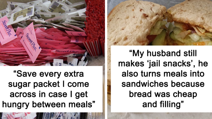 My husband still makes “jail snacks”, he also turns meals into sandwiches because bread was cheap and filling. Spaghetti between bread slices is an example. If we go somewhere like a restaurant, he’s extremely uncomfortable if he doesn’t have his back against a wall so he can see the room and no one can be behind him. He’s very quick to anger/react if he feels disrespected.