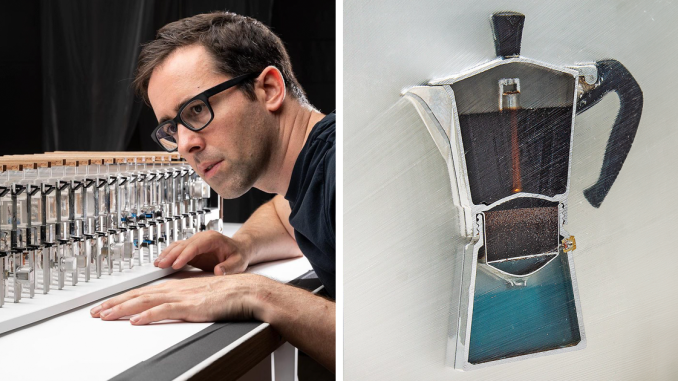 The iconic Bialetti coffee maker was sliced into 11 sheets and bound into a book. It was part of a series that explored the transformation of three-dimensional objects into two dimensions.