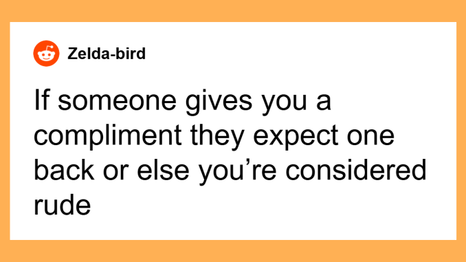 If someone gives you a compliment they expect one back or else you’re considered rude. A “thank you” does not suffice for some reason? I just learned this recently. I’m really bad at giving compliments and always hated receiving them so now I hate them even more.