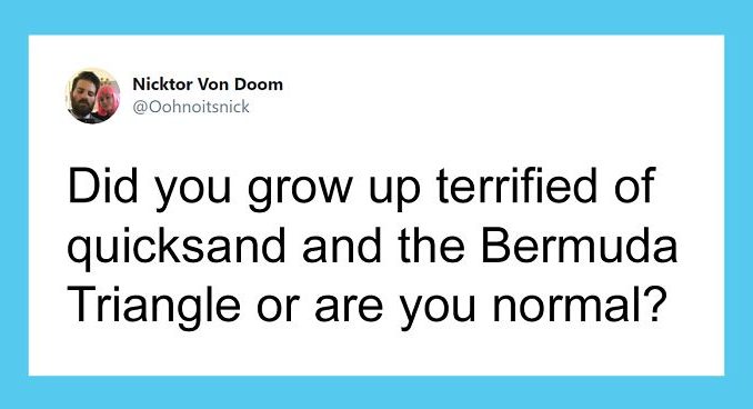 Luckily, we are all past this point and as grown adults, most of these irrational fears are far behind us. But that doesn’t mean we don’t remember them, since so many people on Twitter feel like it was yesterday. After one woman who goes by the Twitter handle @torY asked “did anyone else go through a phase as a kid where u were genuinely concerned ab the bermuda triangle?” it soon became evident that not only was she not the only one, but that there are many more threats we had to endure as kids.