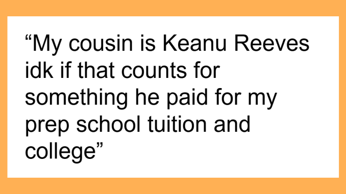 My cousin is Keanu Reeves idk if that counts for something he paid for my prep school tuition and college