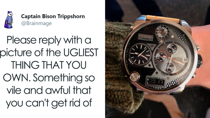 Far from everything we have at home is gorgeous and aesthetic. But have you ever wondered what the ugliest thing that you own is? Actor, comedian, writer, voiceover artist, and self-proclaimed wizard Guy Kelly (aka Brainmage) shared a photo of his chunky Diesel watch and then invited other Twitter users to share photos of the weird things they own in a viral thread.