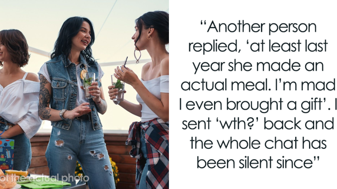 A woman got a text that wasn’t intended for her and learned that a bunch of guests at a birthday party she organized were pretty unhappy that she didn’t serve a “full meal.” So she turned to the internet to ask if somehow she had done something wrong. Commenters debated where her responsibilities ended and the guests’ entitlement began.
